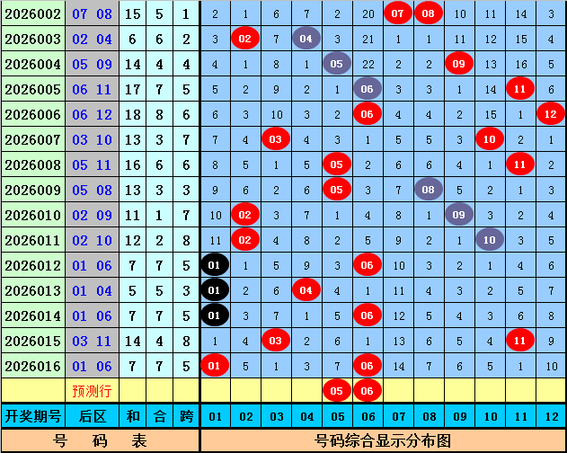 后分袂析:上期该位开出奖号01和06,和值为7,跨度为5,后区前4次开出和值7和跨度5时,其下期奖号分别为:08+12、04+10、01+04、03+11,号码奇偶比为3:5,大小比为4:4,012路比为2:4:2,本期后区号码参考05、06、08、11、12,精选两码05、06。